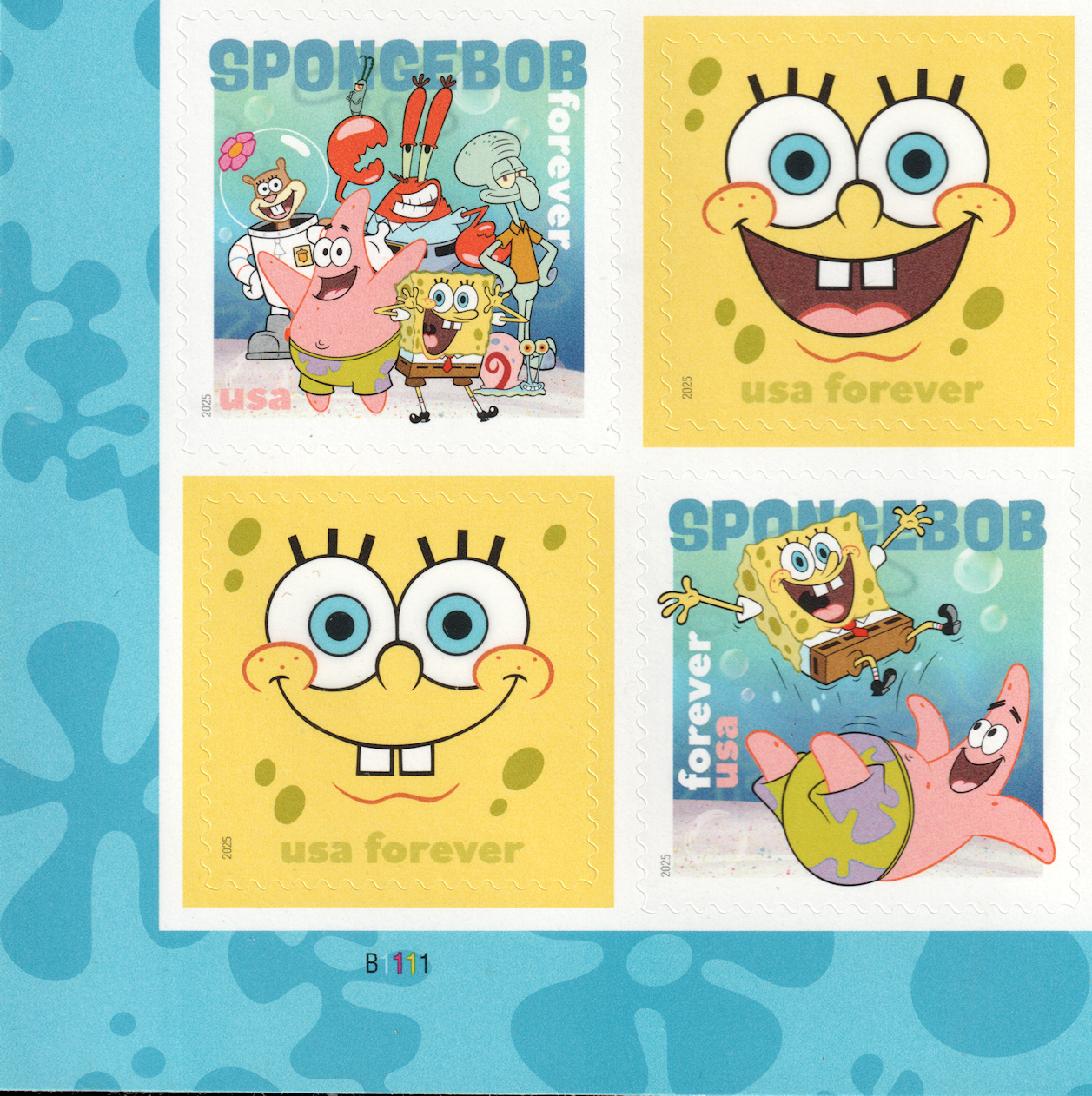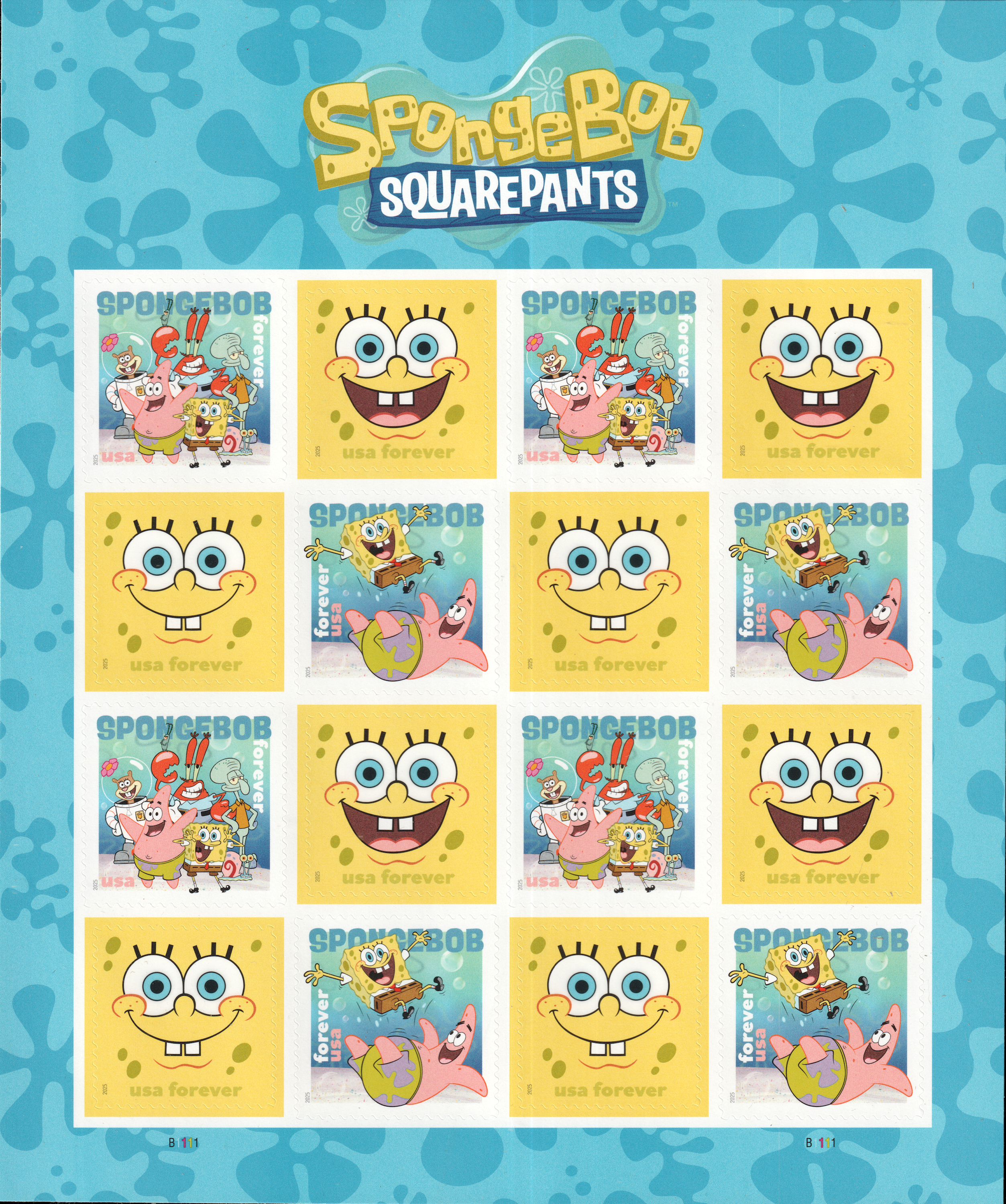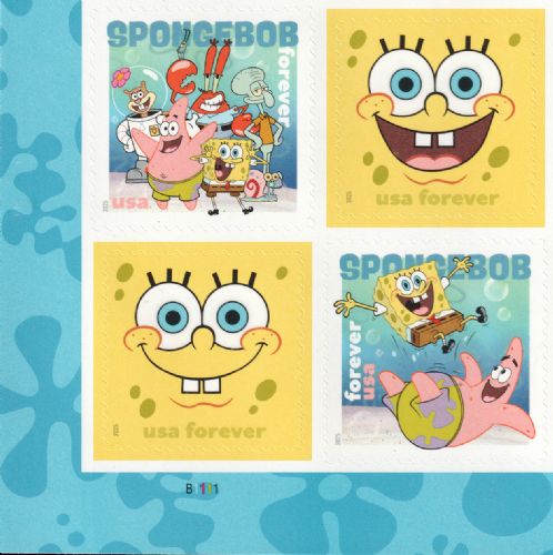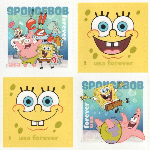 | — Back: | © 2025 USPS • USPS logo • Two barcodes (487200) • Plate position diagram (4) • Promotional text • © 2025 Viacom International Inc. All Rights Reserved. Nickelodeon, SpongeBob SquarePants and all related titles, logos and characters are trademarks of Viacom International Inc. SpongeBob SquarePants created by Stephen Hillenburg. • Nickelodeon’s trademarked logo. |