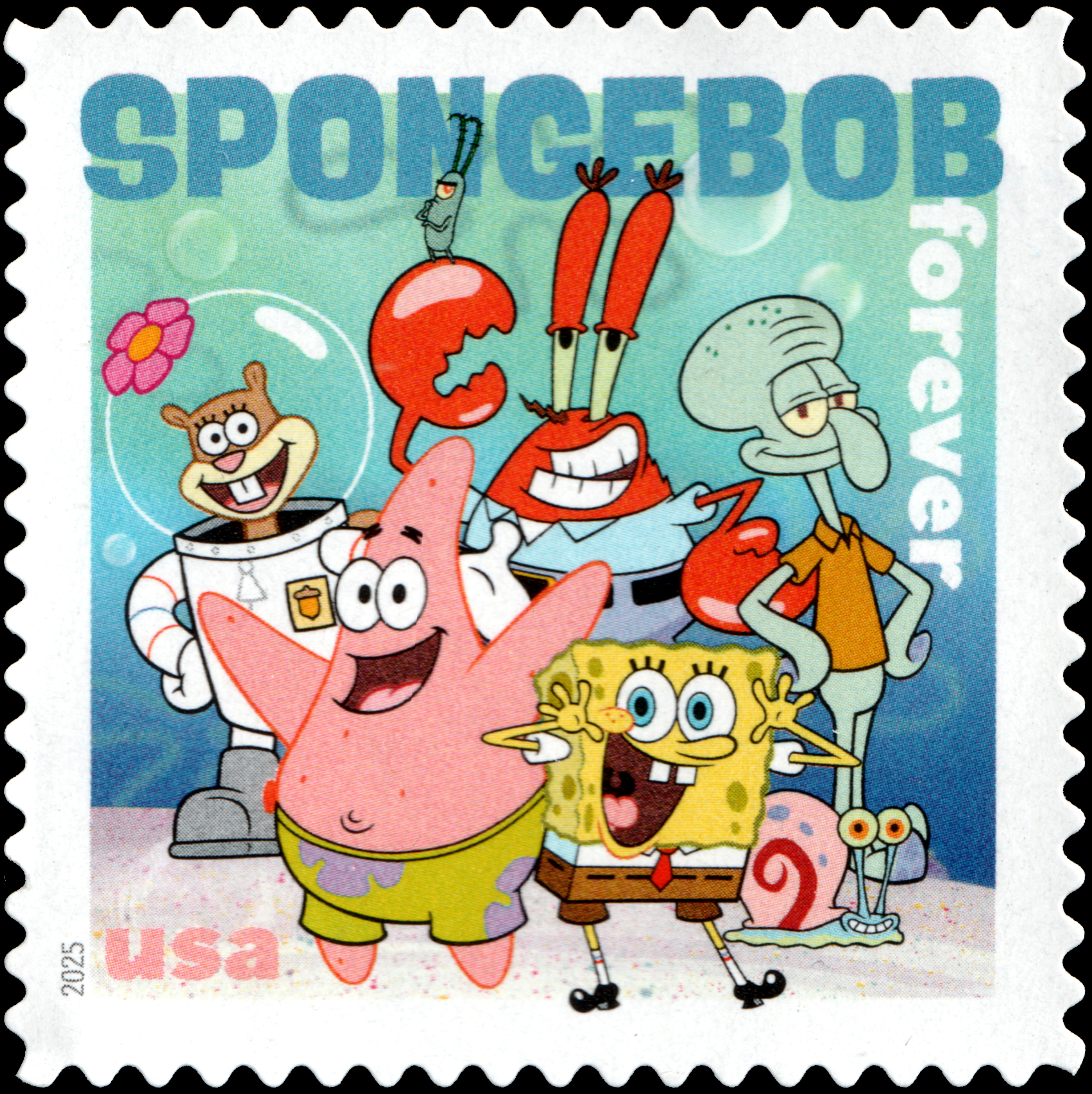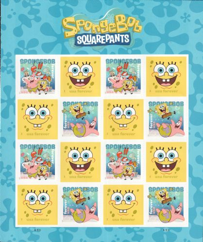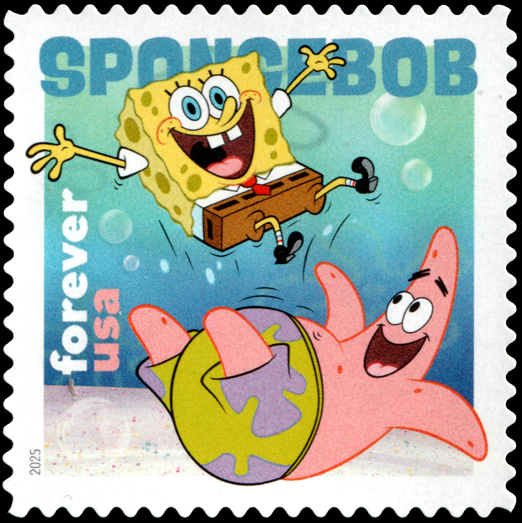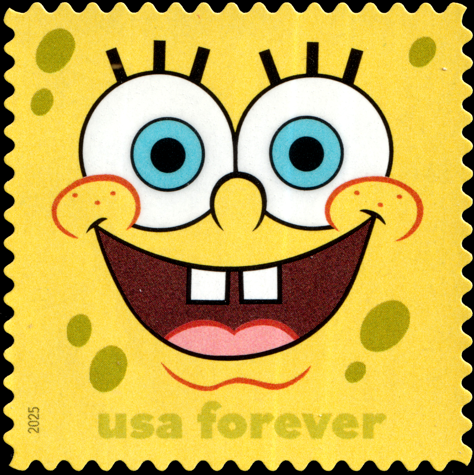 | — Back: | © 2025 USPS • USPS logo • Two barcodes (487200) • Plate position diagram (4) • Promotional text • © 2025 Viacom International Inc. All Rights Reserved. Nickelodeon, SpongeBob SquarePants and all related titles, logos and characters are trademarks of Viacom International Inc. SpongeBob SquarePants created by Stephen Hillenburg. • Nickelodeon’s trademarked logo. |